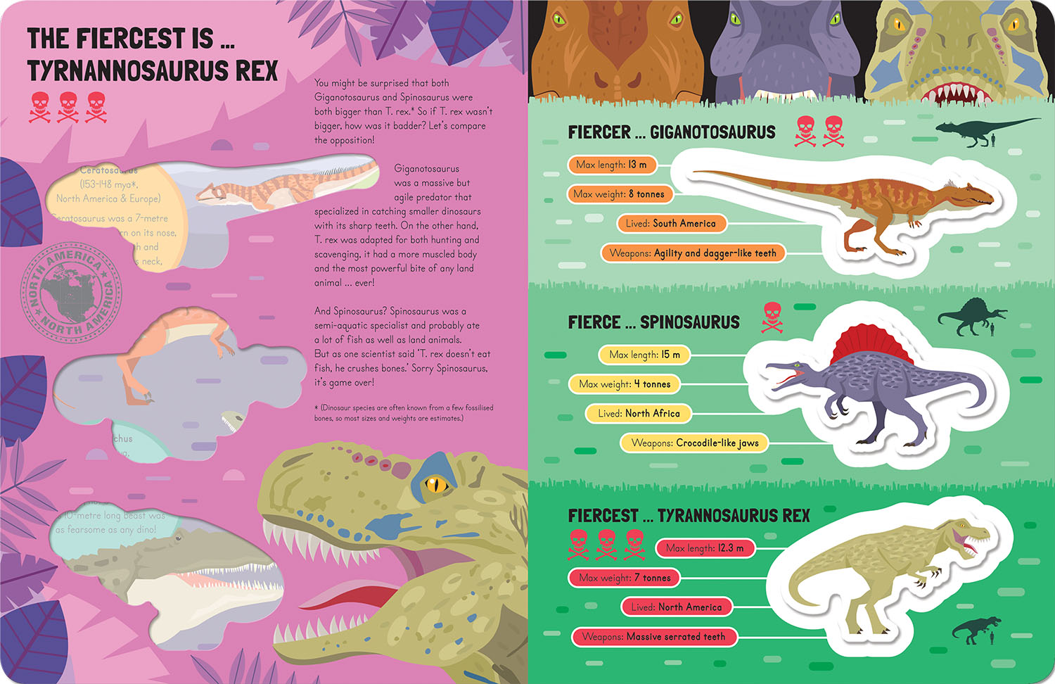 From horrible hunters, supersize sauropods, deadly defenders and more, this unique Elevate book features raised pictures and ranking reveals to encourage curiosity and exploration of some of the most fierce dinosaurs and prehistoric creatures that ever lived on Earth. From terrifying Tyrannosaurus rex and armoured Ankylosaurus to vicious Velociraptor and spiky Triceratops, this book is packed with 250 facts to discover and learn as you challenge yourself to guess which dinosaurs are fierce, which are fiercer and which dinosaurs are the fiercest!