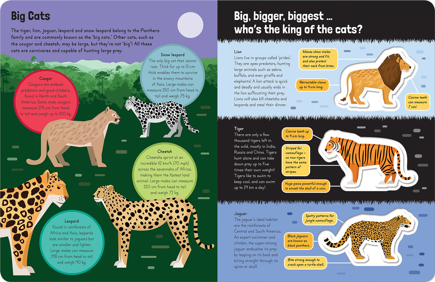 From big cats, beastly bears and more, this unique Elevate book features raised pictures and ranking reveals to encourage curiosity and exploration of some of the most amazing animal giants on Earth. From lions with 4-cm long claws and terrifying tigers that weigh 300kg to bamboo-munching giant pandas and enormous polar bears, this book is packed with 250 facts to discover and learn as you challenge yourself to guess which creatures are big, which are bigger and which creatures are the biggest!