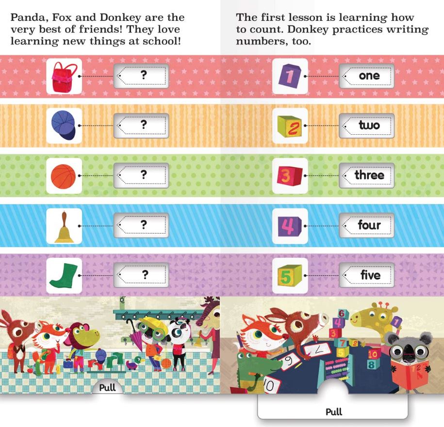 The pull-the-tab format is a perfect method of teaching children key first words. Simply encourage them to pull the tab on each page that will reveal the word beside the picture of each item.
