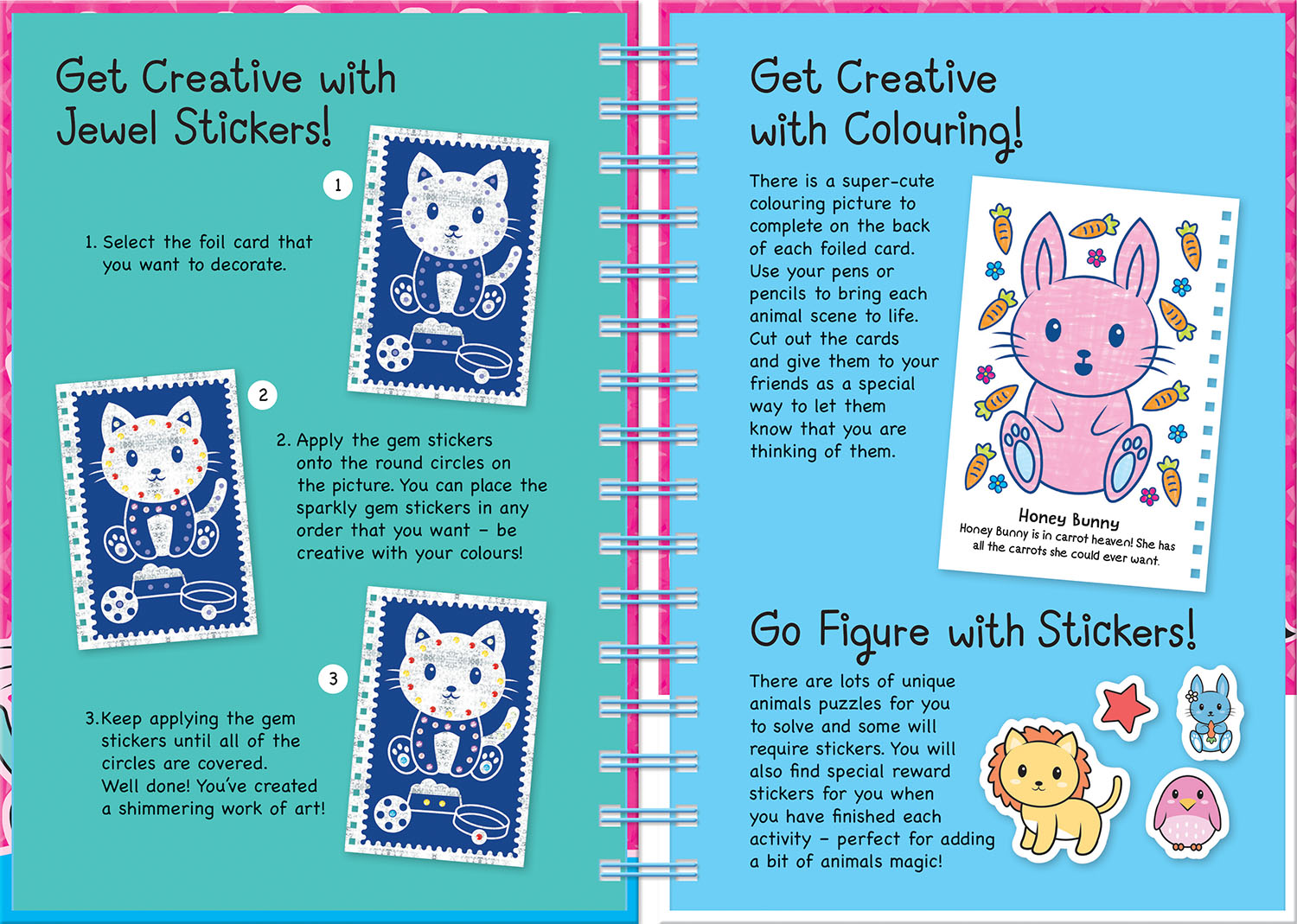 Decorate 8 foiled cards with shiny, colourful jewel stickers and become a jewel art superstar in no time. Simply take the sheet of special stickers and create pawsome patterns on the adorable animal pictures. From pretty puppies to cute kittens and bouncy bunnies, there are lots of animals to decorate with super-shiny stickers.