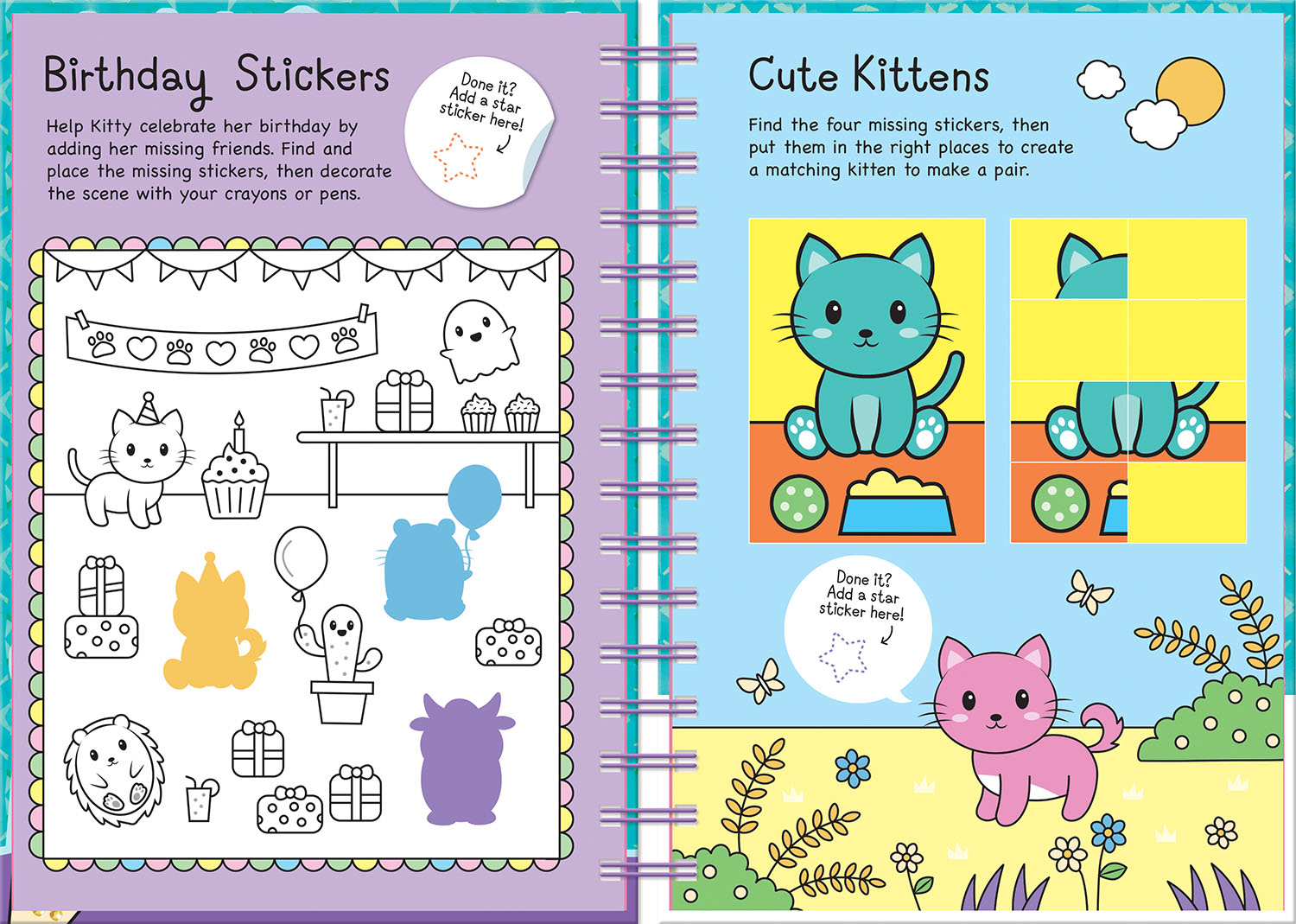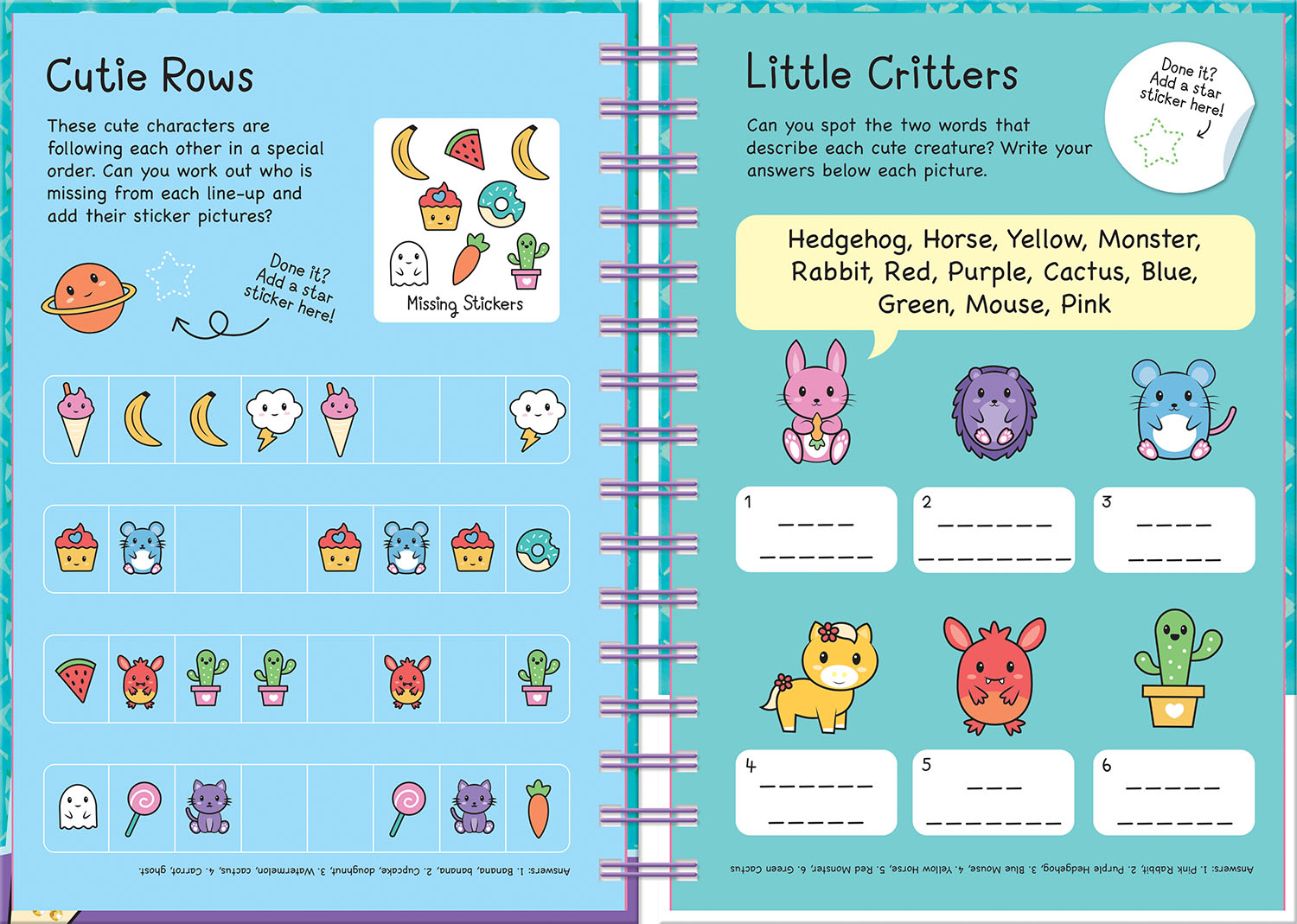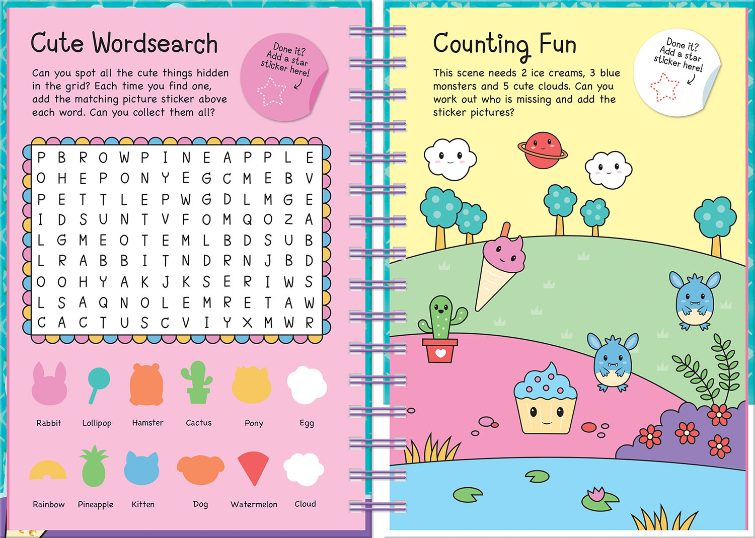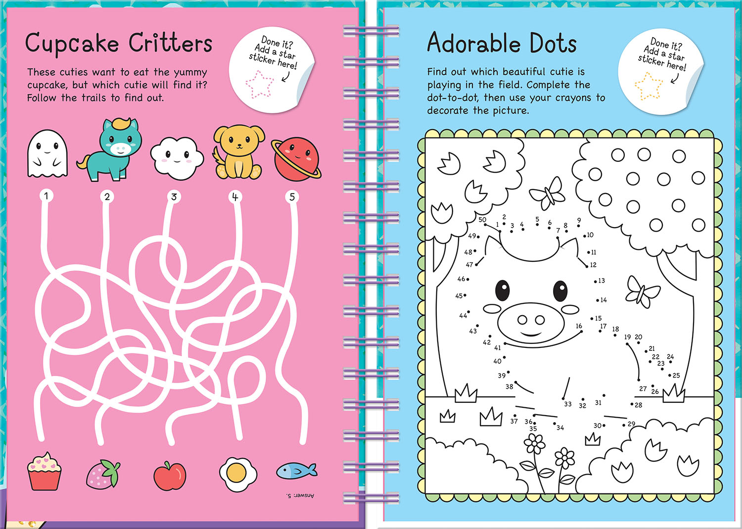 Complete over 20 pages of cute puzzles, like count-and-match activities, word searches, colouring pages, mazes and much more.