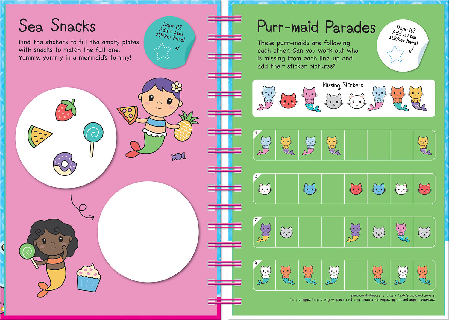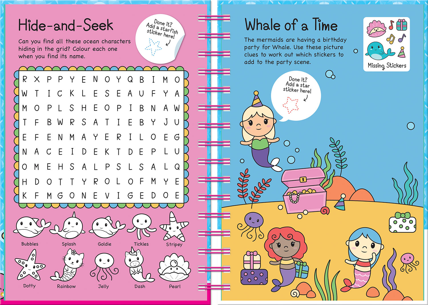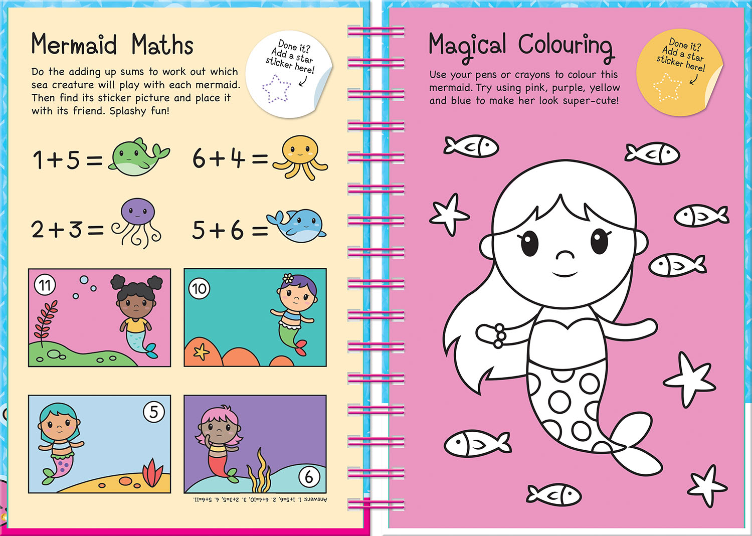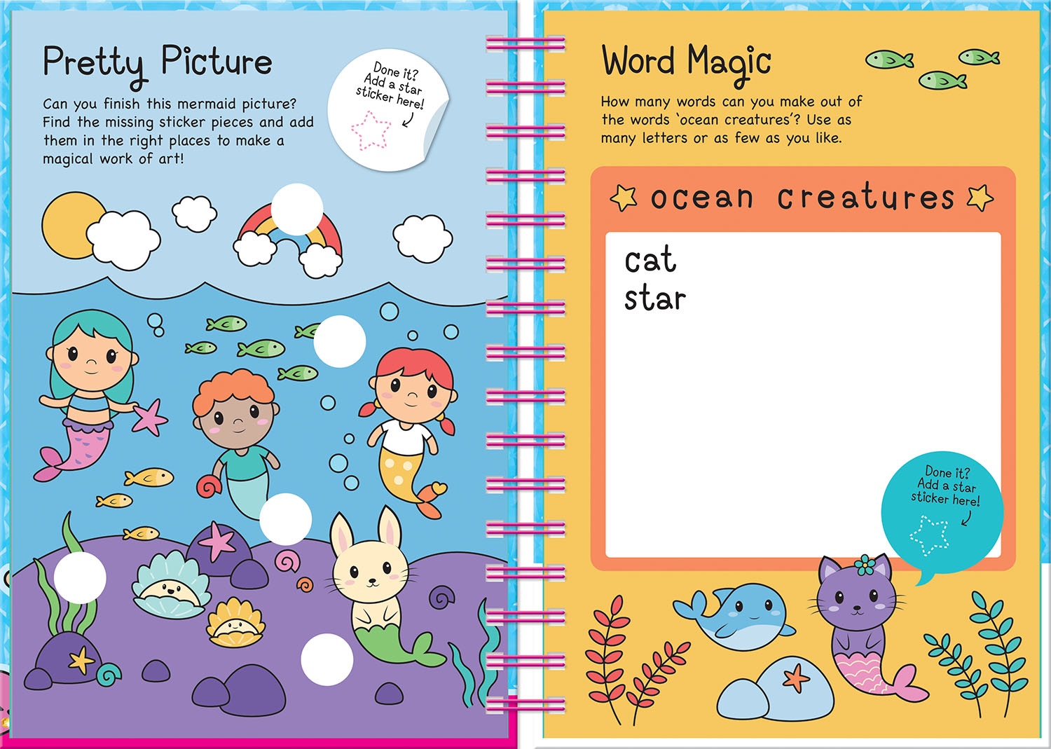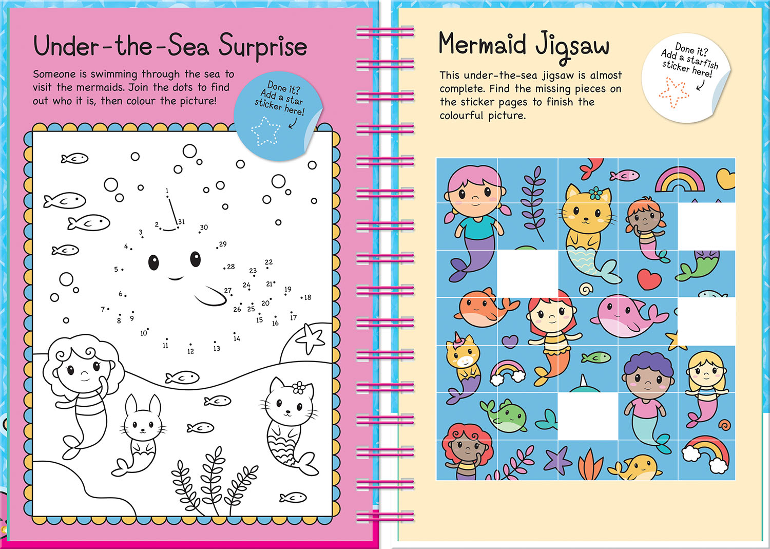 Complete over 20 pages of mermaid puzzles, like sticker jigsaws, dot-to-dots, colouring pages, mazes and much more.