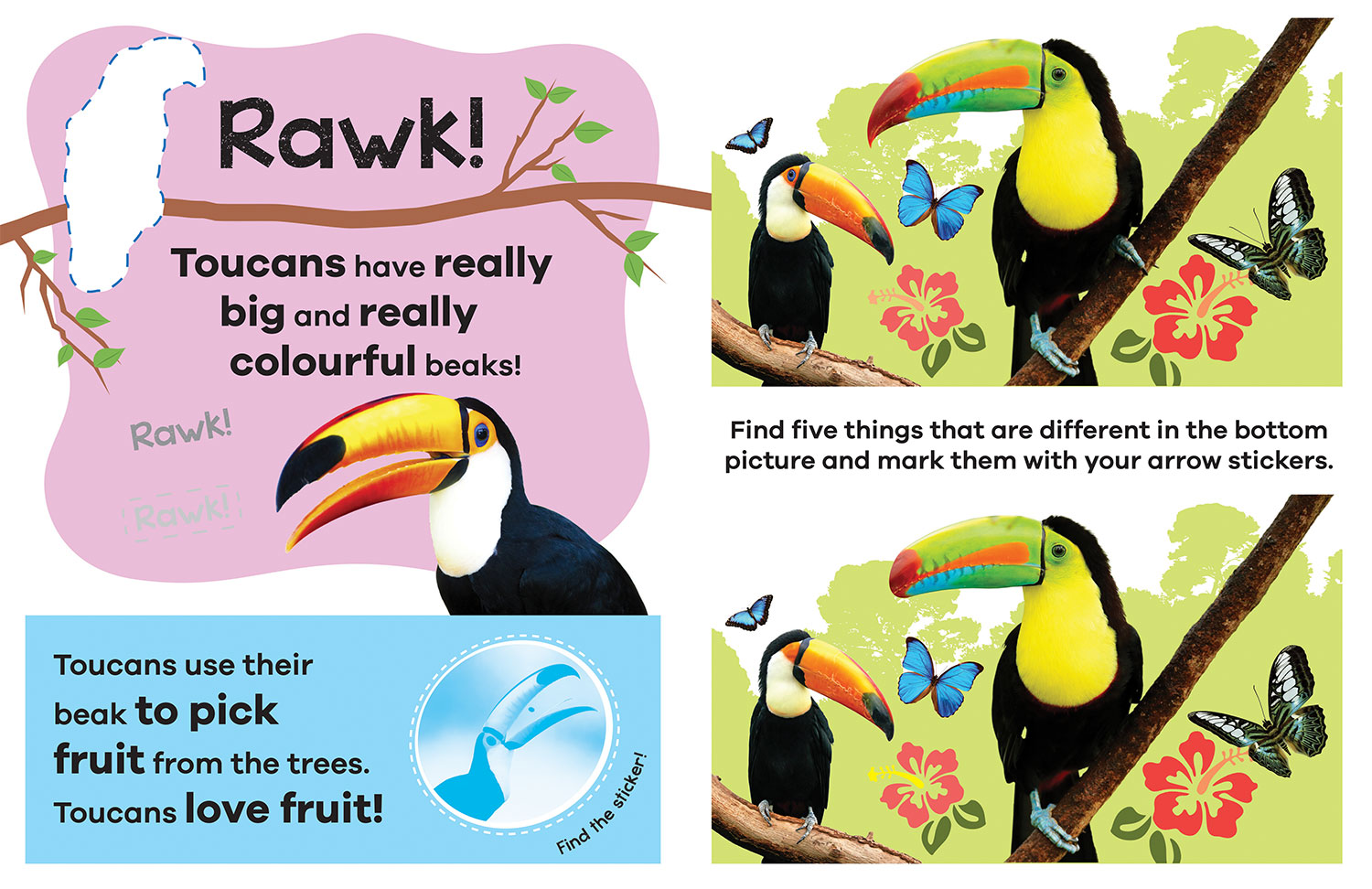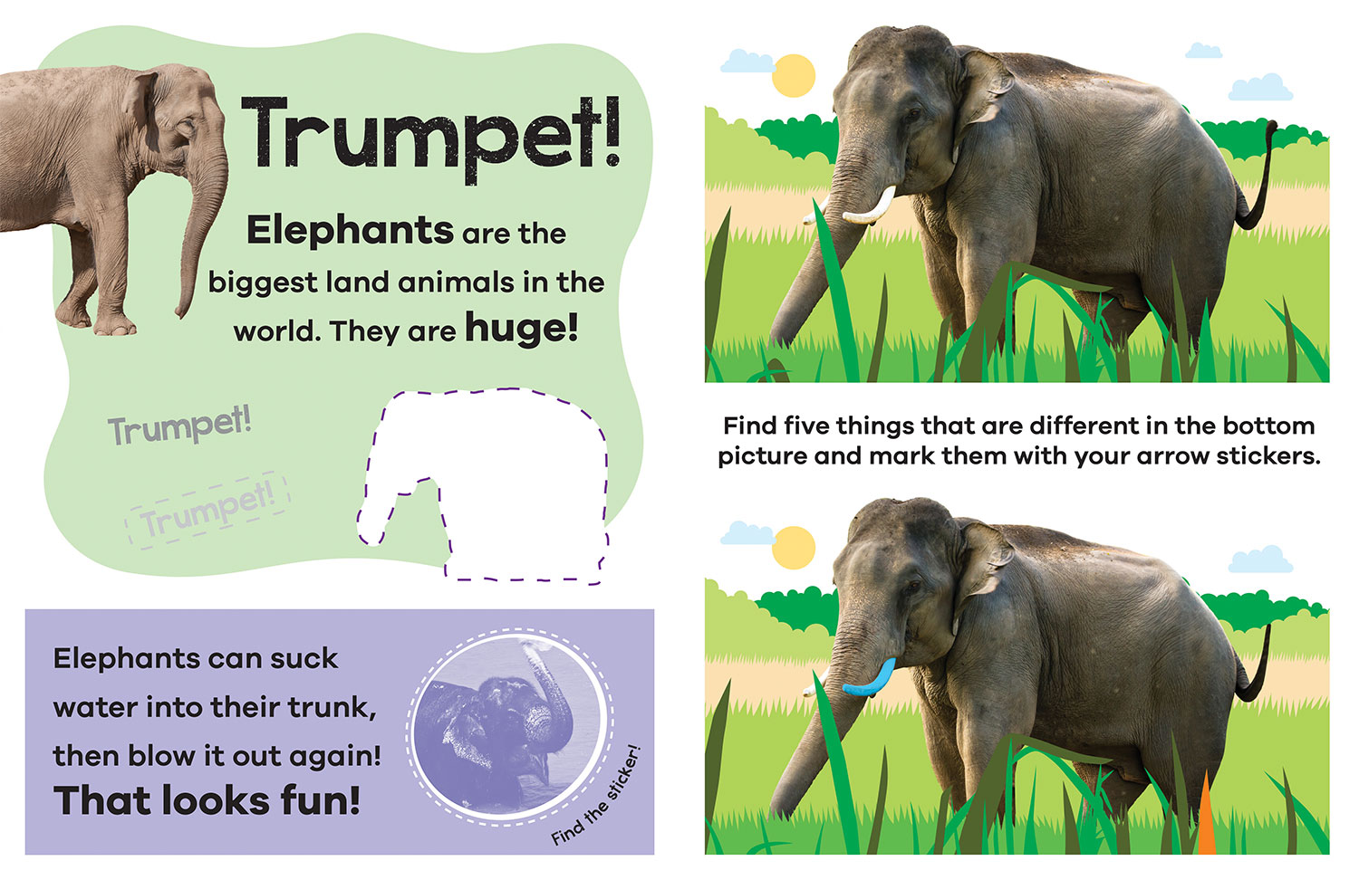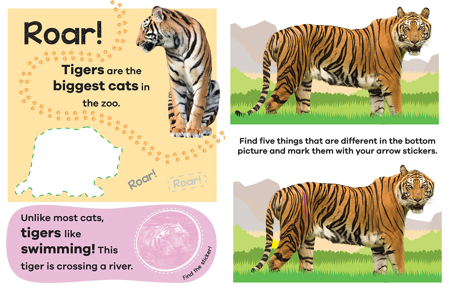 Join the zoo animals inside for spot-the-difference sticker fun. Discover chimpanzees, crocodiles, tigers and more, then spot and stick the five differences between the photographic animal scenes on each spread. Simple, easy-to-read text about each animal combines together with bold, colourful graphics and appealing photographs for parent-child sharing. Onomatopoeic words throughout add to the early learning fun for boys and girls age 3 and up.