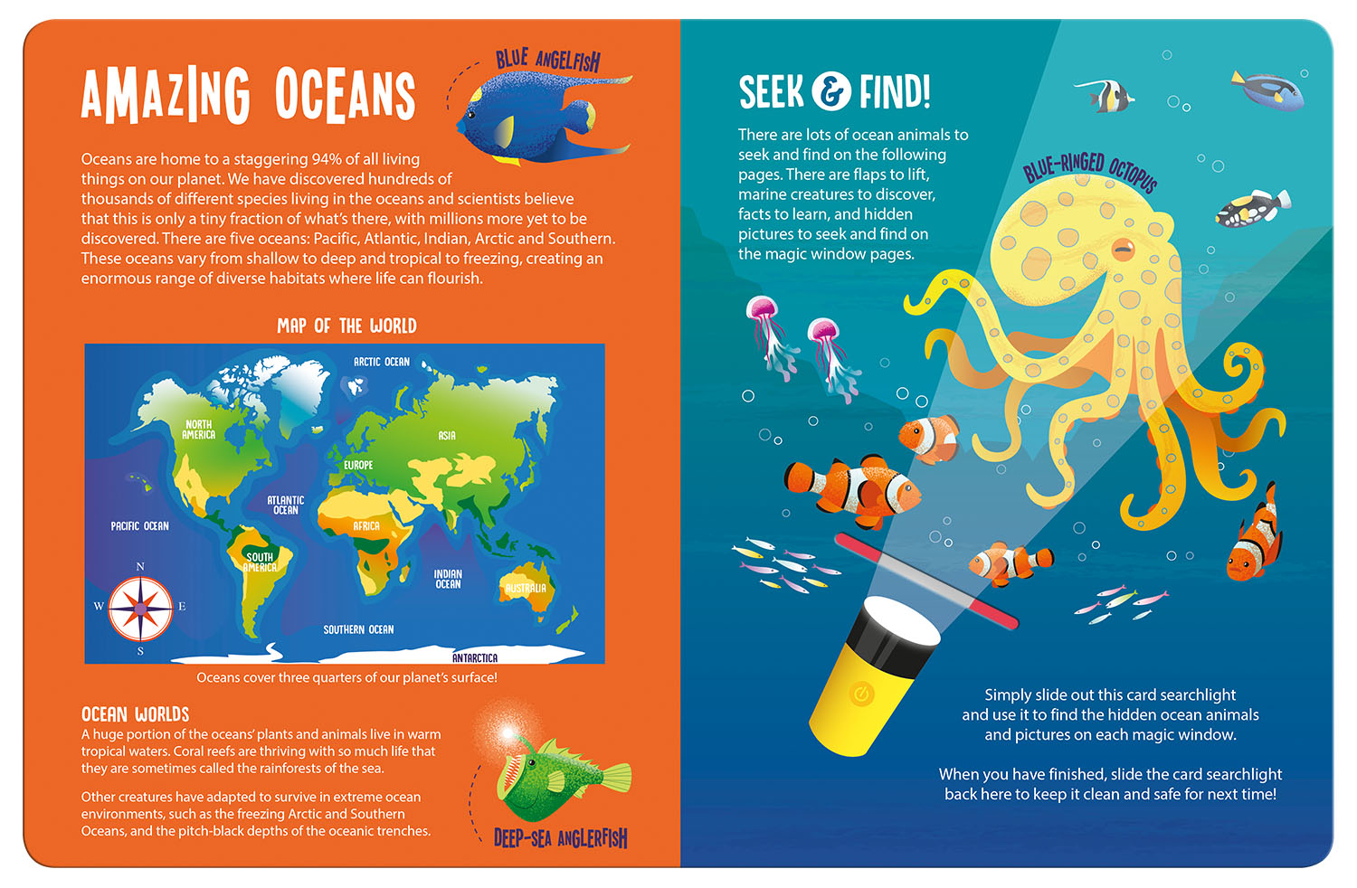 Seek and Find incredible ocean animals and learn hundreds of fascinating facts by lifting the flaps and using the magic card searchlight in this innovative hardback novelty gift book. With friendly and easy-to-understand text and vibrant full colour artwork on every page, this amazing reference book will delight all children and will provide a great introduction to the underwater world of ocean animals! Features lift-the-flaps and three magic searchlight seek and find pages.