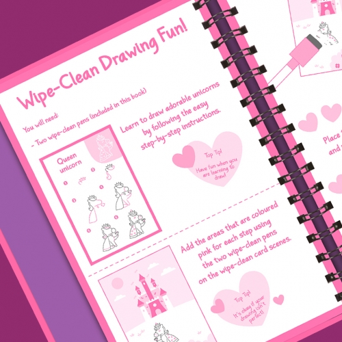 Learn to draw awesome animals, dinosaurs, unicorns and vehicles with the two special wipe-clean pens and reusable wipe-clean drawing pages!